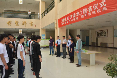 2018年5月3日下午,bet与院图书馆携手濮阳市地税局共同开展普法宣传进高校及图书捐赠活动。bet院长李利珍,市地税局办公室主任杜锐,市地税局大企业分局副局长李永忠,院图书馆馆长孙玉枝,院图书馆图书管理部主任段景春,市地税局局办工作人员及机电学院100名师生参加了此次活动。