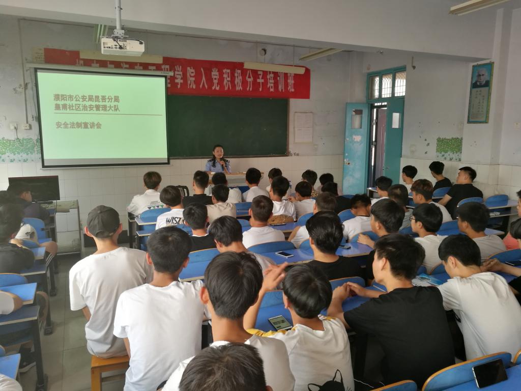 为进一步加强bet安全稳定工作,营造良好的安全与法制教育环境和氛围,提高大学生法制观念,树立法律意识,贯彻好、落实好《濮阳职业技术学院安全稳定工作督导检查实施方案》(濮职院【2018】31号)文件要求。2018年5月31日,由bet主办的大学生安全与法制教育讲座在教学楼四楼合堂教室举行。本次讲座邀请到濮阳市公安局昆吾分局皇甫社区治安管理大队大队长刘明磊、民警王瑞莉前来讲授,由bet学工副院长王勇主持,bet全体辅导员老师及2017级五年制全体学生参加。